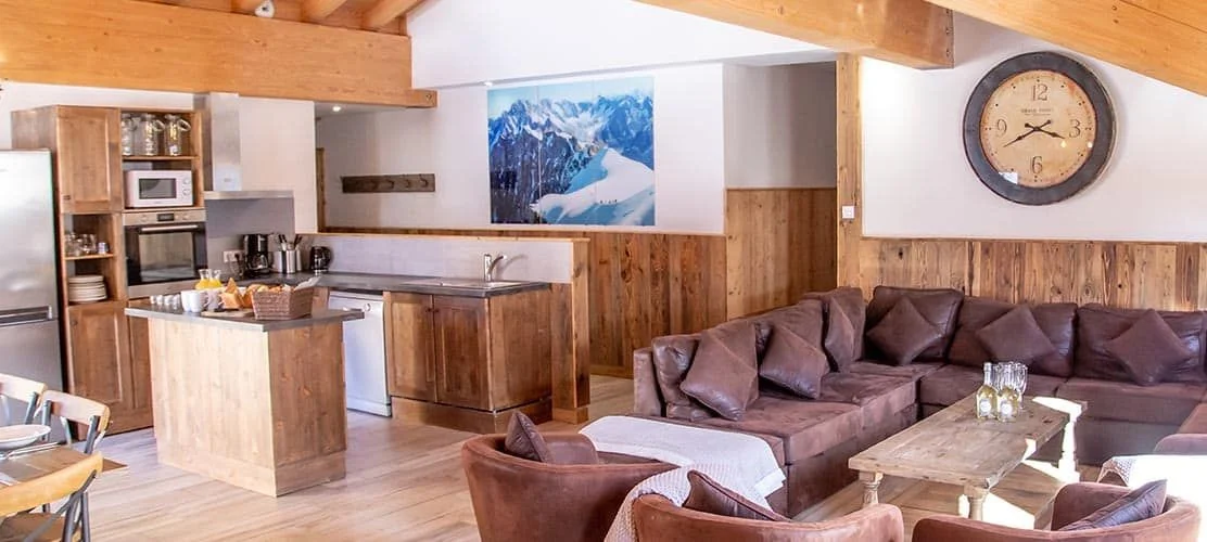 The chalet is on the top floor of a small recently built building and benefits from a hot tub on the balcony with ski-slope views and a sauna indoors. There’s an open plan living-dining room with fabulous panoramic mountain and piste views together with a comfortable seating area. There are six bedrooms with en-suite bathrooms.